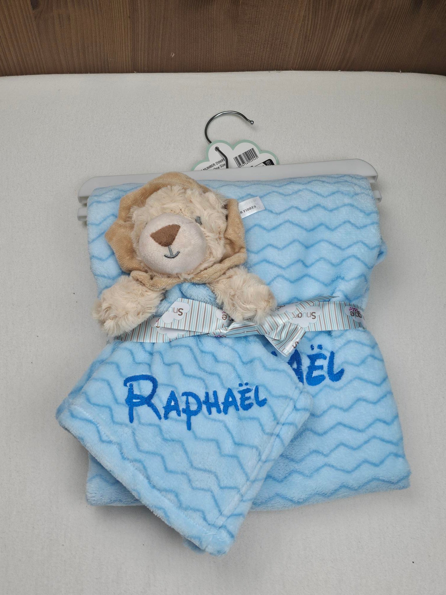 - Un couverture été bébé bleue 75cm x 90cm (personnalisable) en polyester