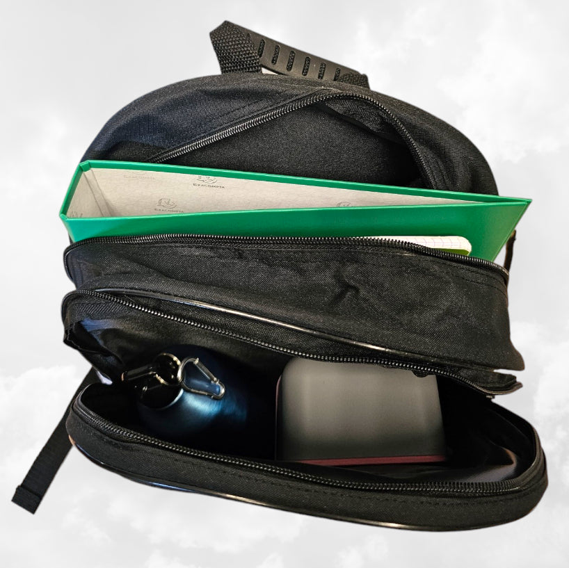 Accessoires non inclus (classeurs, cahiers, gourde).